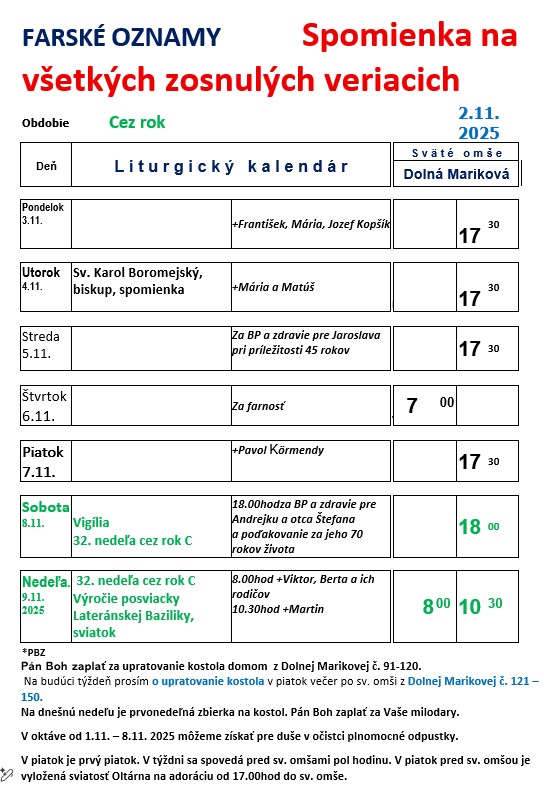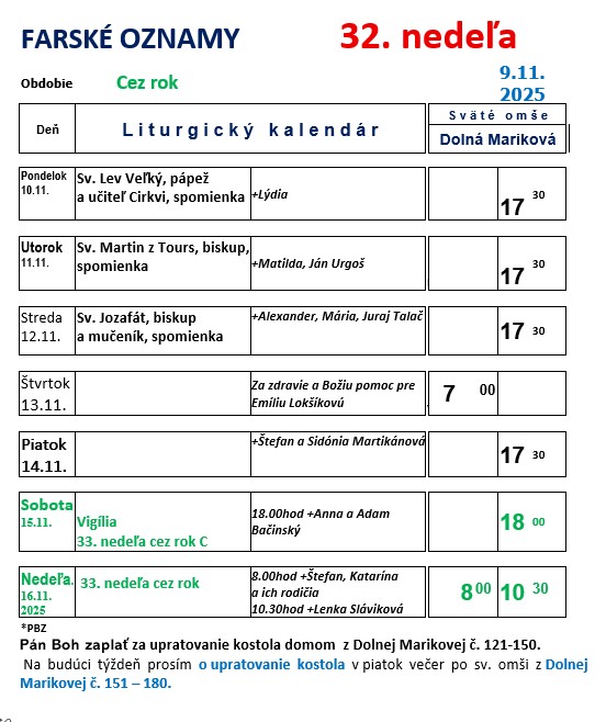 Upratovanie kostola v piatok večer po sv. omši prosím domy z Dolnej Marikovej č. 91-120.