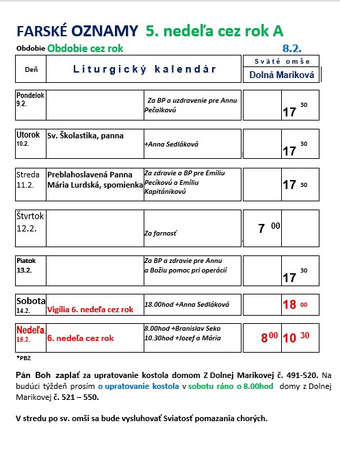 Upratovanie kostola v sobotu ráno o 8.00hod prosím domy z Dolnej Marikovej č. 521-550