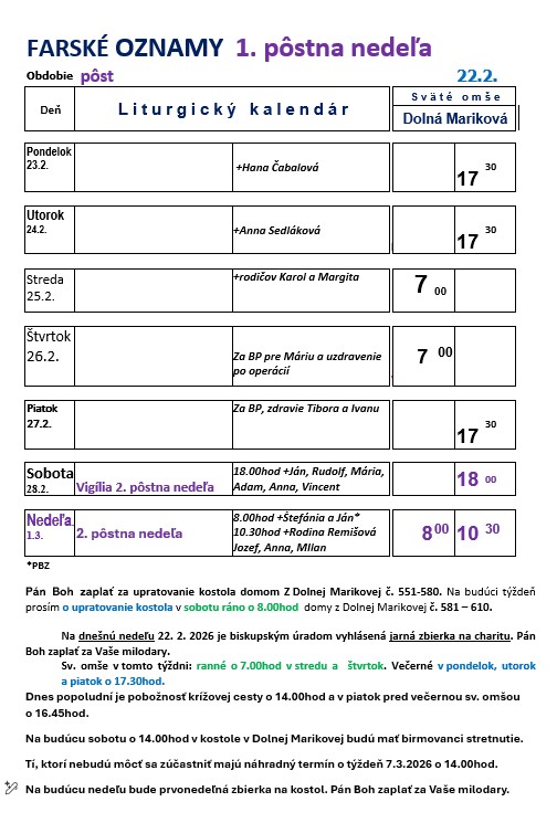 Kandidáti na sviatosť birmovania, ktorí chcú prijať túto sviatosť 18. apríla 2026 sa stretnú v kostole v Dolnej Marikovej v sobotu 28.2.2026 o 14.00hod.