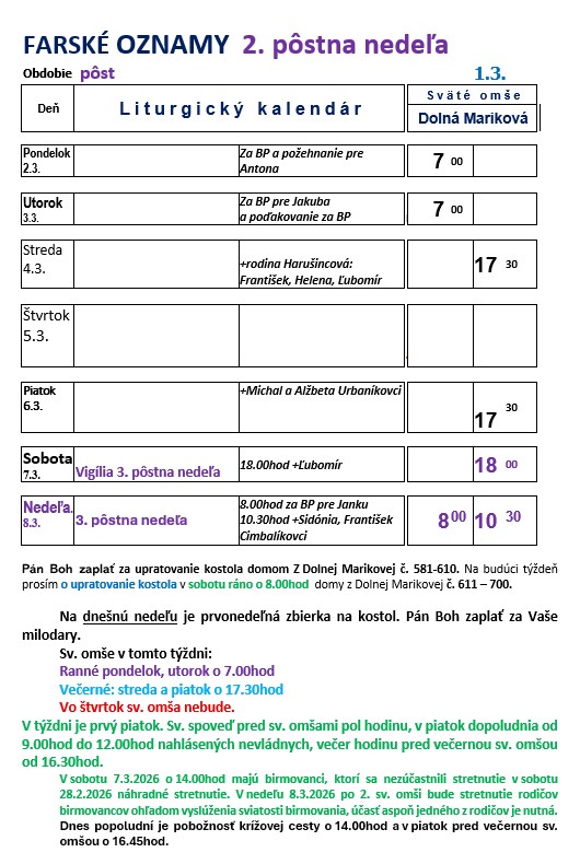 Farské oznamy sú vyvesené aj pred kostolom, aj v kostole v presieni aj v nedeľu pri sv. omšiach sú vyhlasované.